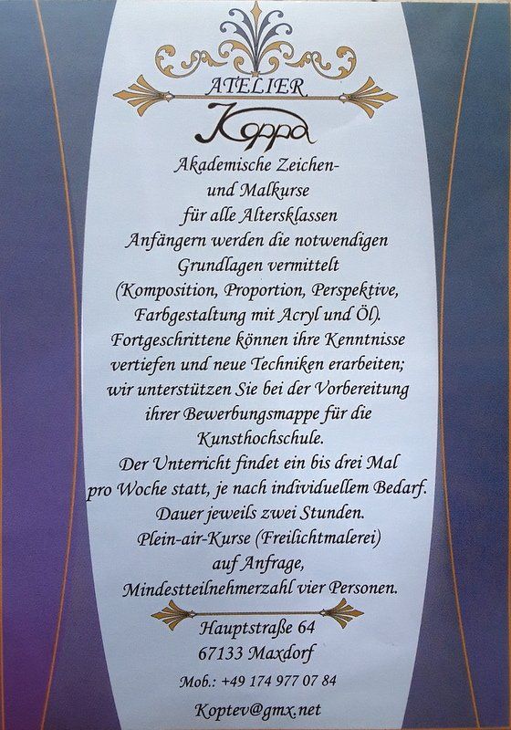 Dienstags und Freitags von 16-18 Uhr biete ich Mal kurse für Kinder (ab 12 Jahren) und Erwachsene an.